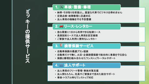 ツイート 株式会社ミッキーは、自動車の販売・リース・車検・整備・保険を通してモビリティライフをサポートします。 トピックス 株式会社ミッキーは、よろこんで納車引き取りをさせていただきます。 株式会社ミッキーは、 ご入庫いただいたお客様のお車を綺麗にしてお返します。